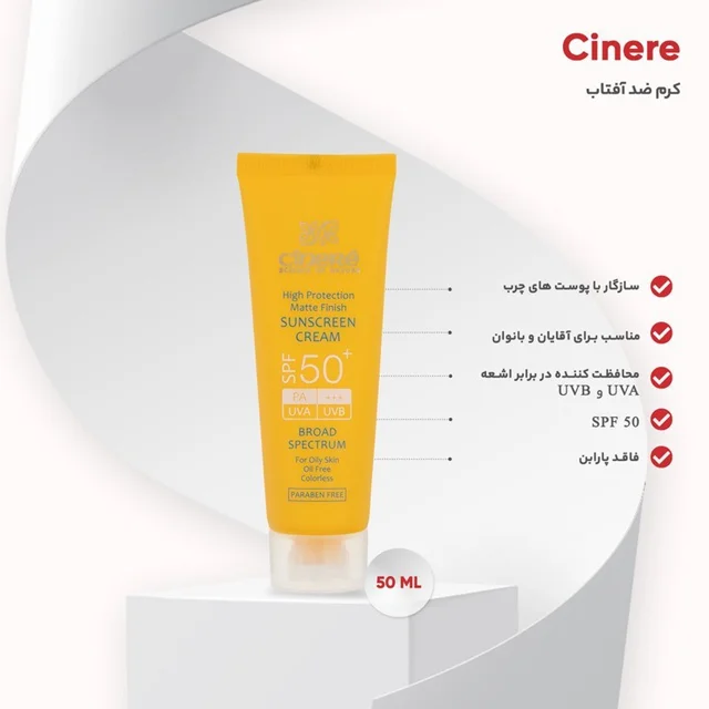 کرم ضدآفتاب بی رنگ سینره مدل SPF 50 مناسب پوست چرب با حجم 50 میلی لیتر ، با توجه به حساسیت افراد دارای پوست چرب، در استفاده از محصولات آرایشی و بهداشتی، تولید و ساخته شده است. این کرم علاوه بر اینکه از پوست در برابر اشعه های UVA و UVB محافظت می کند، به واسطه فرمولاسیون ویژه خود پس از خشک شدن، ظاهری غیر چرب (مات) بر روی پوست ایجاد می کند. کرم ضد آفتاب SPF 50 بدون رنگ سینره دارای ساختاری بسیار سبک است. در ساختار این کرم از فیلترهای ضد آفتابی استفاده شده که افرادی که دارای پوست چرب هستند با اطمینان خاطر می توانند از آن استفاده کنند.