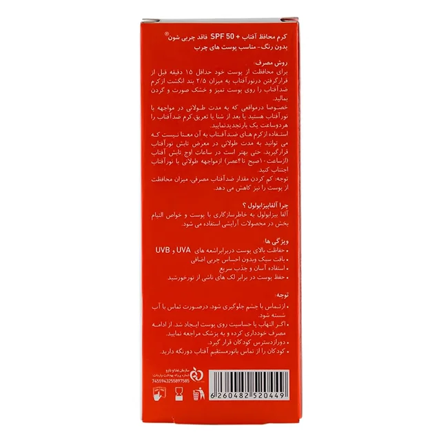 این ضد آفتاب فاقد چربی بدون رنگ، حاوی کلاژن هیدرولیزه شده است که موجب جلوگیری از ایجاد چین و چروک روی پوست و پیری زودرس آن میشود. این محصول دارای تاییدیههای معتبر بر اساس تستهای درماتولوژیکی بوده و فاقد رنگ، چربی و پارابن است، ماندگاری و دوام طولانی دارد و چون بیرنگ است برای استفاده آقایان هم گزینه مناسبی به شمار میرود.